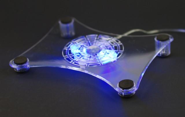 Dercriere: Cooler cu 1 ventilator silentios; Structura foarte rezistenta, confectionata din acril transparent; Luminat cu led albastru; Alimentare prin USB; Nu necesita instalare